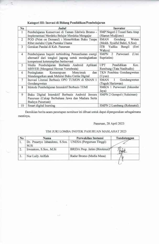 Pengumuman Nominator Lomba Inotek Pasuruan Maslahat Kabupaten Pasuruan Tahun 2023