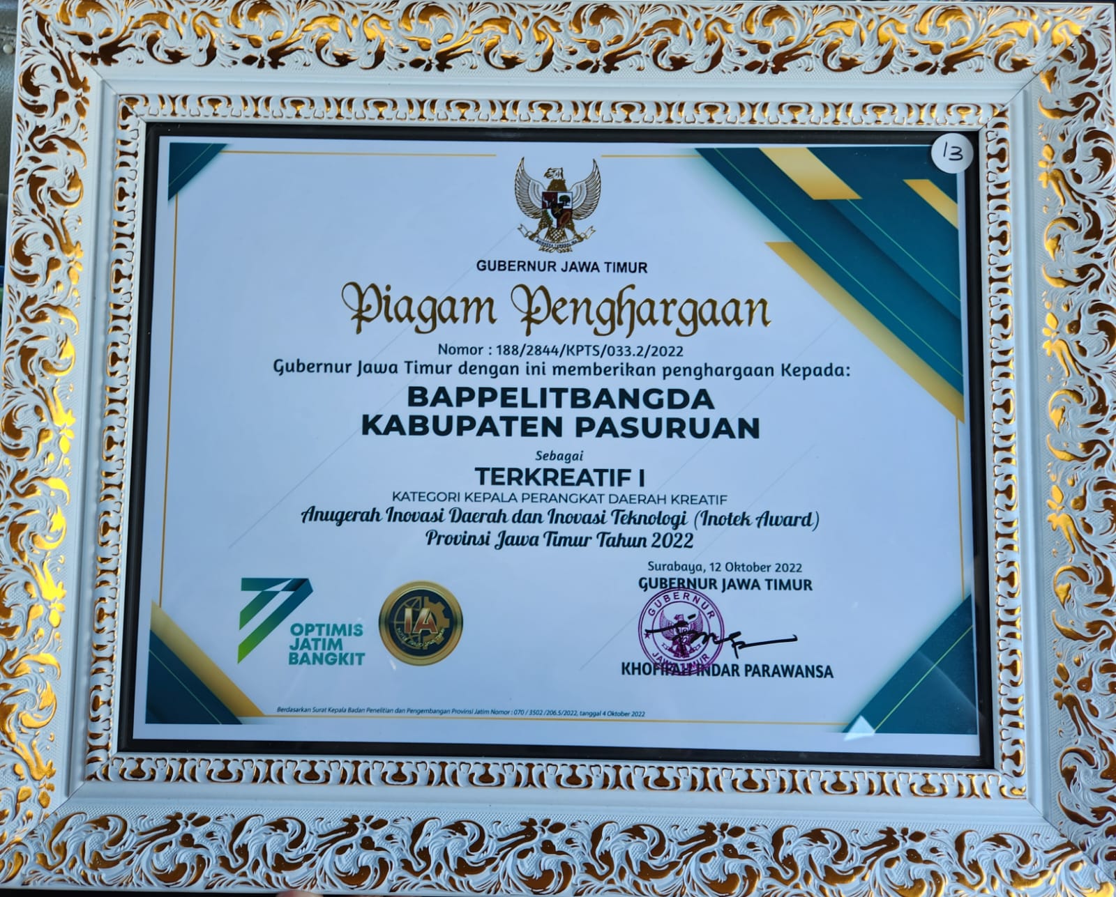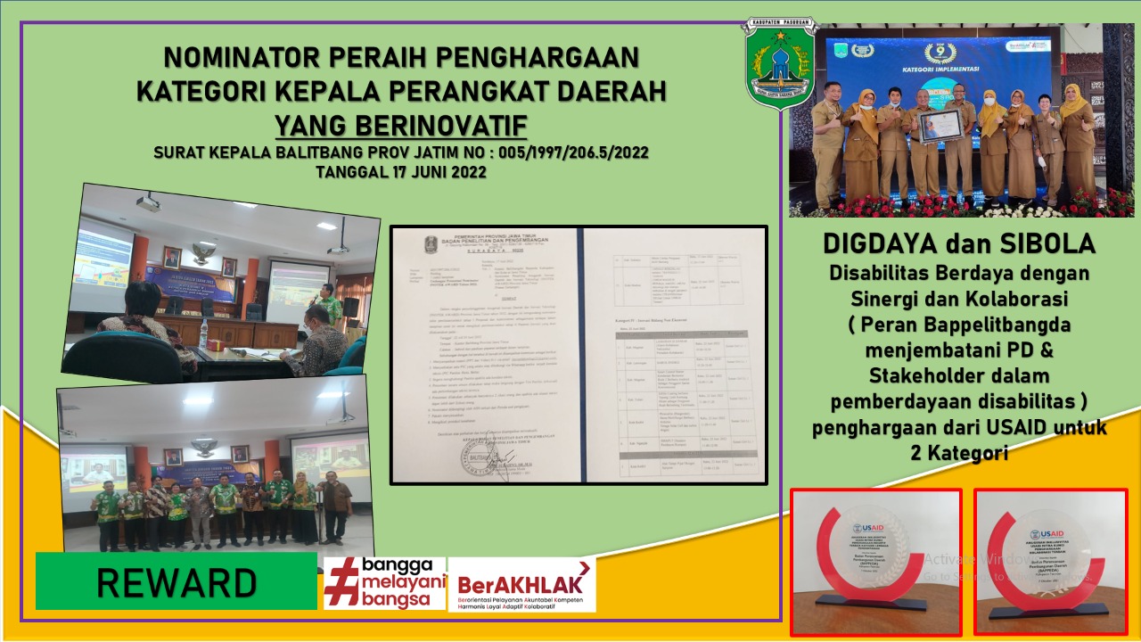 Kepala Bappelitbangda Kabupaten Pasuruan, Ir. IHWAN, M.Si secara langsung menerima Penghargaan dari Gubernur Jawa Timur Khofifah Indar Parawansa pada upacara HUT Provinsi Jawa Timur ke-77 yang dilaksanakan di Gedung Grahadi Surabaya, Rabu 12 Oktober 2022. Penghargaan ini diterima atas Prestasi Bappelitbangda Kabupaten Pasuruan meraih TERKREATIF I ( SATU ) KATEGORI KEPALA PERANGKAT DAERAH KREATIF Anugerah Inovasi Daerah dan Inovasi Teknologi ( Inotek Award ) Provinsi Jawa Timur Tahun 2022. “ Terima kasih dukungan dan arahan Bapak Bupati dan Wakil Bupati Pasuruan, serta Perangkat Daerah yang telah berkreasi menciptakan Inovasi untuk mendukung pekerjaan yang pada akhirnya memberikan kemudahan pelayanan kepada Masyarakat.” demikian yang disampaikan oleh Ir. IHWAN, M.Si.